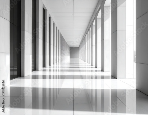 hallway, corridor, white, light, architecture, interior, design, column, modern, clean, perspective, tiled, floor, bright, vertical, parallel, symmetric, minimal, abstract, building, structure, linear, glossy, long, tunnel, passage, empty, nobody, daylight, shadow, pattern, geometric, contemporary