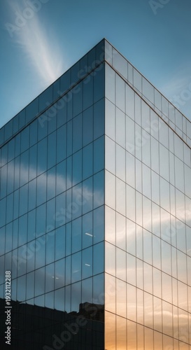 A sleek, modern glass facade captures the sky, symbolizing robust institutional power and transparent, yet untouchable, authority, contemporary, architecture, geometric