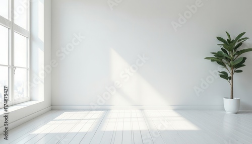 A sleek white-walled studio room with clean lines creates a bright, minimalist backdrop.