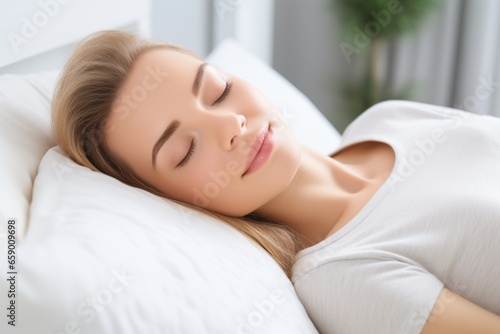 A sleeping woman with her eyes closed on a cozy bed