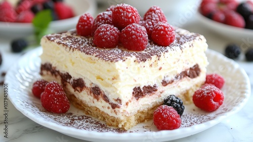 A slice of tiramisu with fresh raspberries and cocoa powder.