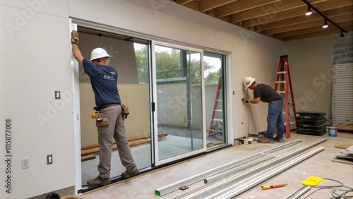 A sliding glass door in the process of installation framed by an unpainted wall with a construction crew member holding it steady while a colleague secures the track.
