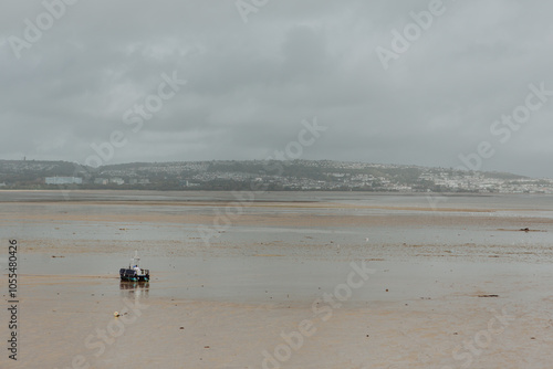A small boat resting in the ocean floor during a low-tide at Swansea Bay in Mumbles