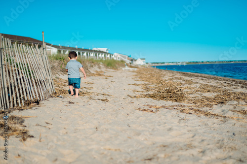 A small boy walks on a beach in cape cod next to a fence and resorts