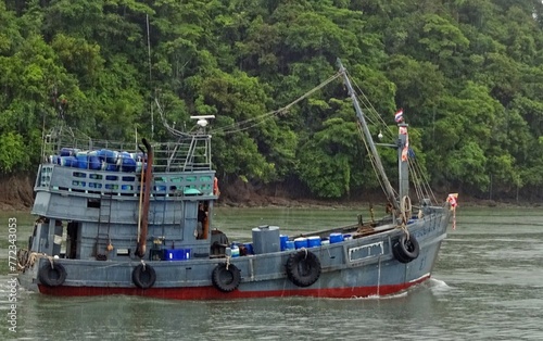 A small cargo motor boat sailing on the sea.