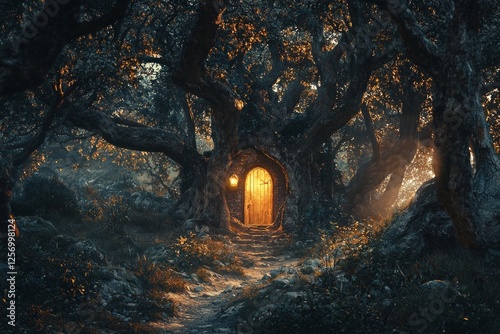 A small door in the middle of an ancient forest with many trees, leading to another world. The path is illuminated by light from inside and leads through the tree branches.