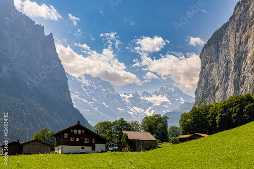 A small farmhouse sits in a valley surround by the mountains of the Swiss Alps