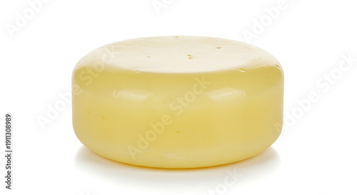 A small, round, yellow mini cheese wheel, possibly Gouda or Edam, isolated on a white background, ready for consumption.