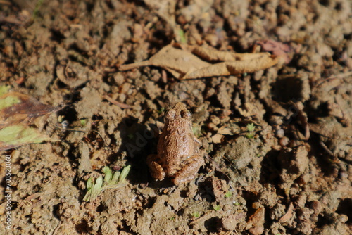 A small sized, Long legged cricket frog is sitting on the muddy soil