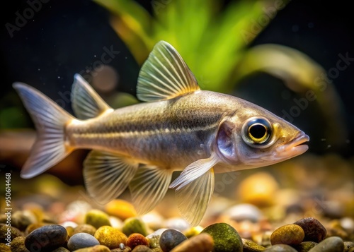 A small, slender fish with bulging eyes and pectoral fins used for walking on muddy surfaces, stands still in a murky aquatic environment.
