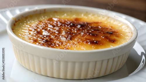 A small white bowl of creamy crème brûlée sits on a decorative plate, showcasing its golden caramelized top