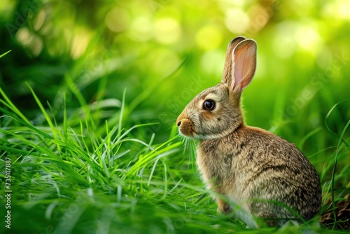 A small Wood Rabbit is sitting in the grass, gazing at the camera