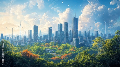 A smart city with energy-efficient buildings powered by solar panels and wind turbines. The city infrastructure is integrated with advanced AI systems, showcasing sustainability as a key element of