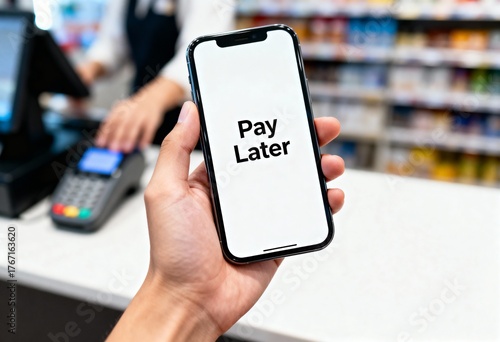 A smartphone showing the words "Pay Later" is held in hand at a retail checkout counter.