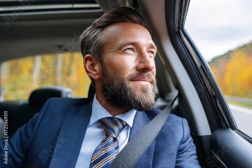 man, bearded, suit, attaching, car, passenger, travel, journey, window, looking, autumn, foliage, tree, nature, happy, smiling, relaxed, businessman, transportation, vehicle, road trip, scenic, view, landscape, photogenic, adult, male, inside, tranquil, thoughtful, professional, automobile, comfort, enjoyment, pleasant, peaceful, adventure, day, daylight, executive, successful, contentment, freedom, escape, sunroof, seatbelt, serene