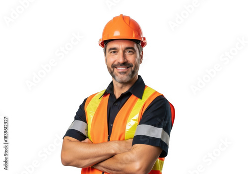 A smiling construction worker wearing an orange hard hat and a bright yellow safety vest with arms crossed isolated on transparent background
