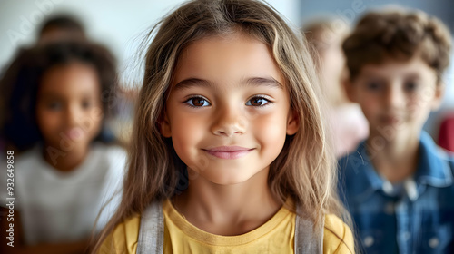 A smiling girl in a classroom with other children in the background.