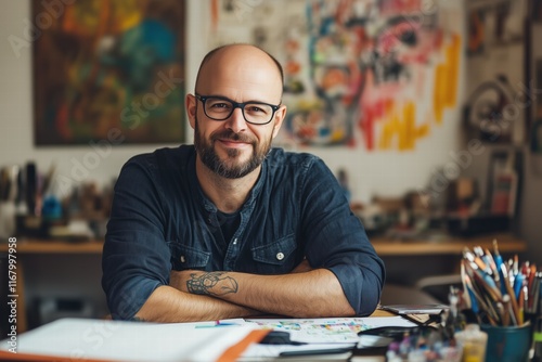 A smiling man designer with glasses and a beard sits at a desk filled with art supplies, showcasing a creative workspace. The background features colorful artwork and sketches.