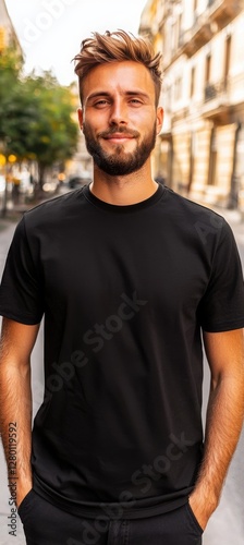 man, black, t-shirt, street, urban, relaxed, chic, pose, greenery, confidence, youth, friendly, atmosphere, trendy, setting, photo, walking, personality, joy, photogenic, model, expression, smile, cool, attracted, charme, happiness, male, appearance, brightness, hair, portrait, modern, beard, lifestyle, style, fashion, casual attire, environment, natural, summer, city