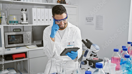 scientist, laboratory, technology, research, health care, man, happy, glove, microscope, indoor, laboratory, tablet, science, professional, male, equipment, experiment, biotechnology, medicals, chemistry, researcher, smiling, protection, goggles, test, analysis, study, white, coat, blue, work, occupation, innovation, clinical, pharmaceutical, safety, discovery, education, pipette, bottle, beaker, ampoule, datum, result, precision, procedure, concentration, testing