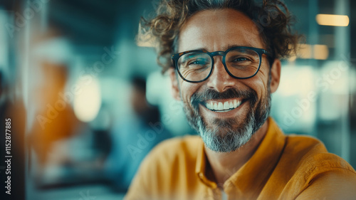 A smiling man with curly hair and glasses, wearing yellow shirt, exudes confidence and warmth in modern office environment. His cheerful expression brightens workspace