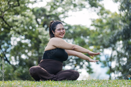 A smiling plus-size Asian woman stretches her arms while sitting cross-legged on green grass in a park. A positive outdoor wellness scene promoting body positivity, flexibility.