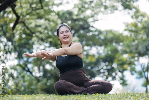 A smiling plus-size Asian woman stretches her arms while sitting cross-legged on green grass in a park. A positive outdoor wellness scene promoting body positivity, flexibility.