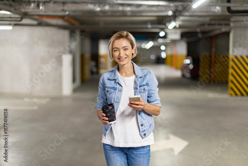 woman, parking, smiling, car, travel, garage, happy, phone, denim, urban, hot drink, blond, jean, modern, smartphone, hair, vehicle, cheerful, mobile, texting, building, jacket, casual attire, lifestyle, architecture, holding, city, transportation, technology, white, young, communication, digital, waiting, adult, business, concrete, t-shirt, inside, day, looking, indoor, device, connection, cyberspace, online, message, caucasian, text