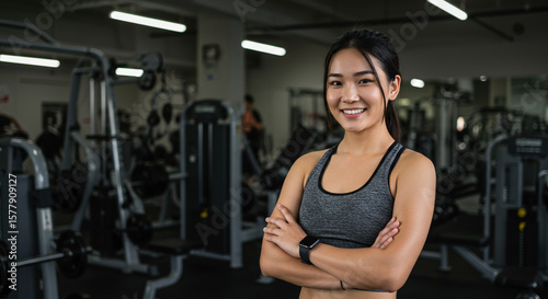 woman, gym, fitness, exercise, physical exercise, portrait, smile, asian, healthy, lifestyle, sport, training, body, strong, muscle, equipment, indoor, person, arms crossed, active, wellness, motivation, strength, health, female, fit, young, background, modern, fitness centre, exercise machine, weightlift, power, determination, confidence, happy, posing, indoor, athletic, activewear, watch, lighting, facility, weight, machine, trainer