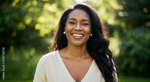 woman, smiling, happy, hair, long, dark, black, beige, top, outdoors, park, nature, green, leaf, tree, sunlight, summer, spring, beautiful, pretty, attractive, confident, healthy, joyful, cheerful, positive, vibrant, energy, carefree, relaxed, peaceful, serene, calm, gentle, kind