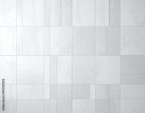 A smooth, modern tiled wall featuring a pattern of varying rectangular shapes in soft white tones, offering a clean and contemporary aesthetic