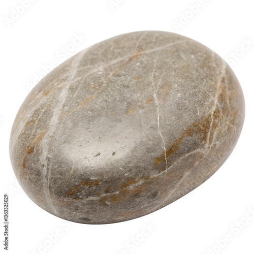 A smooth, oval-shaped stone with a mix of gray and brown hues, featuring subtle white veins running across its surface, isolated on transparent background