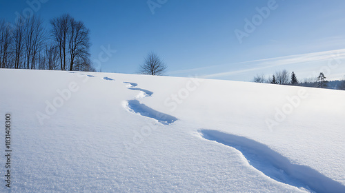 A snowy landscape under a blue sky, with tracks leading across a snow-covered hill. Trees are silhouetted in the distance. A peaceful, wintry scene.