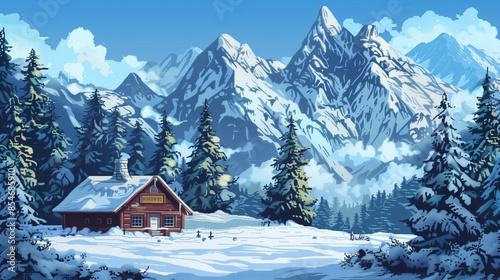 A snowy mountain landscape with pine trees and a cozy cabin , pixel art, game assets