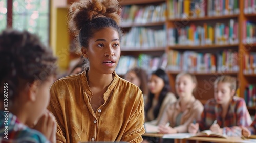A social worker conducting an educational workshop on diversity and inclusion in a public library, with attendees of different ages and ethnicities engaged in interactive activities.