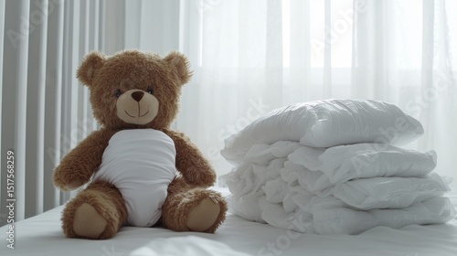 soft, brown, teddy, bear, sitting, upright, white, baby, crib, wearing, neatly, fitted, diaper, next, stacked, pile, disposable, diaper, minimalistic, childcare center, setting, lighting, clean, bedding, smooth, frame, subtile, textured, wall, background, cosy, warm, atmosphere, product, photo