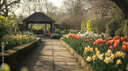 beauty, bloom, colourful, countryside, daffodil, flower, freshness, garden, greenery, lush, morning, nature, pastel, pathway, relaxation, serenity, spring, tulip, vibrant