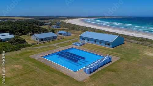 A solar-powered desalination plant providing fresh water to a coastal community, with clean water flowing into storage tanks while residents fill reusable containers.