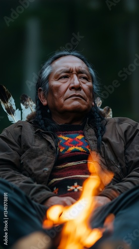 reflective, moment, fire, indigenous, man, campfire, nature, warmth, solitude, contemplation, forest, traditional, attire, glow, expression, culture, evening, peaceful, outdoors, connection, heritage, wisdom, serenity, portrait, stillness, calmness, flames, environment, wilderness, character, deep, emotion, storytelling, gathering, history, spirit, ancestral, night, ritual, landscape, beauty, journey, life, life events