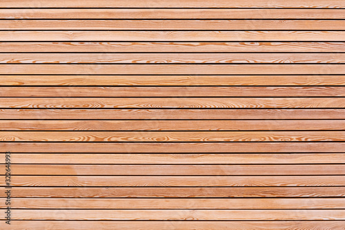 A solid wall of brown wooden planks arranged horizontally. Concept for texture, background, interior