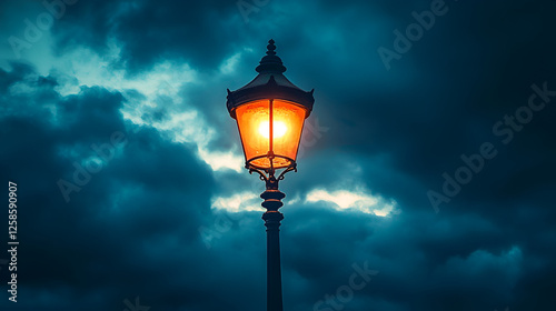 A Solitary Beacon: A single, glowing street lamp pierces the dark, brooding sky, casting a warm, hopeful glow against the backdrop of ominous, swirling clouds.