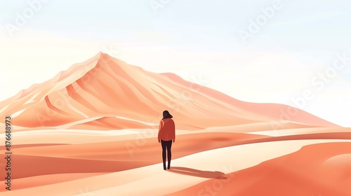A solitary figure stands in a vast desert landscape, gazing at a distant sand dune under a clear sky.
