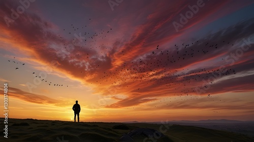 A solitary man stands on a cliff, silhouetted against a vibrant sunset sky, with a flock of birds in flight adding to the dramatic scenery. generative.ai