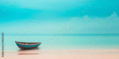 A solitary wooden boat resting on a calm, sandy beach under a clear blue sky, evoking feelings of solitude, peace, and escape with ample space for text.