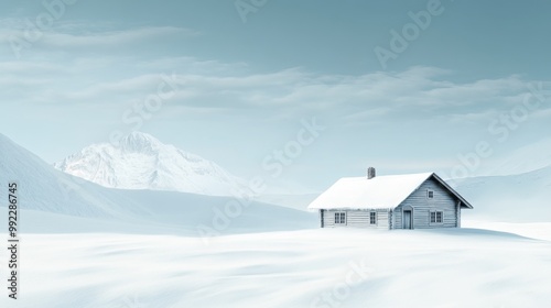 snow, winter, cabin, wooden, mountain, landscape, sky, cloud, white, cold, frost, isolated, serene, quiet, peaceful, remote, wilderness, nature, rustic, glacé, icy, tranquil, minimalist, simplicity, solitude, stillness, atmosphere, beauty, scenic, breathtaking, majestic, huge, horizon, distant, snowy, peak, hill, vale