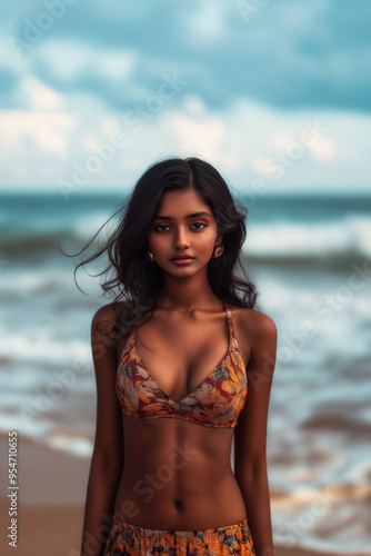 A South Asian woman enjoying a tropical beach vacation, highlighting the beauty of summer holidays and travel destinations