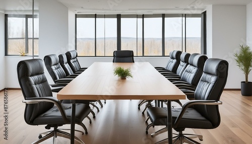 A spacious conference room with a long wooden table, modern black leather chairs, and large