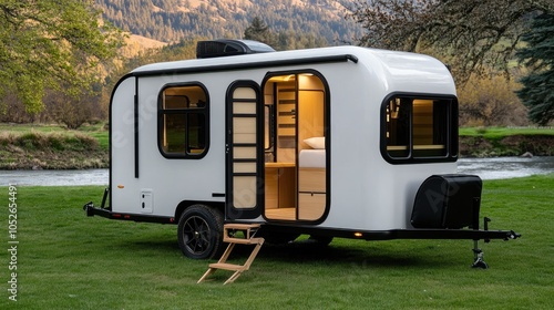 motorhome, family, vacation, grass, lake, summer, travel, outdoors, camping, adventure, picturesque, open, door, roof, ladder, roomy, serene, landscape, nature, vehicle, recreational, tail, light, modern, design, leisure, lifestyle, road, trip, exploration, relaxation, scenic, view, countryside, trailer, amenity, parked, reflections, horizon, get-away, fun, transport, wild, tree