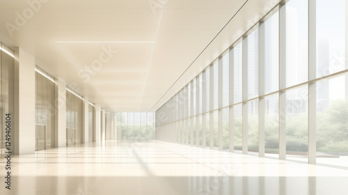A spacious modern interior with large floor-to-ceiling windows allowing soft natural light