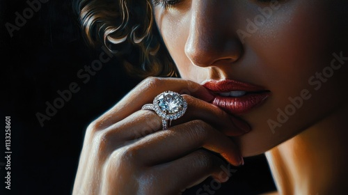 A sparkling engagement ring on a woman's finger, showcased in stunning detail with soft light reflecting on the diamond against a dark background